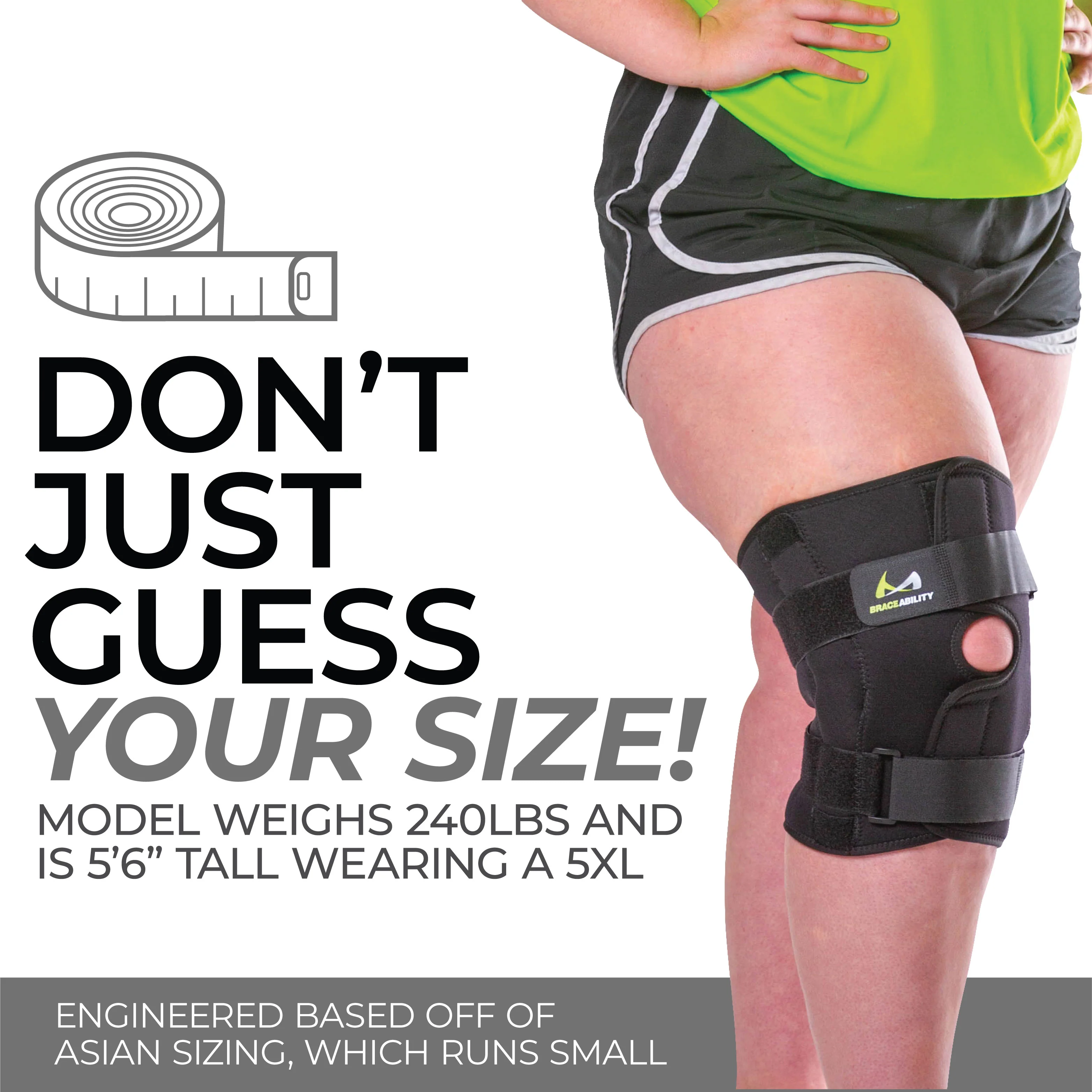 - How do I know what size to get? This brace runs small, please refer to our sizing graphic to choose the right size for you. Using a soft, flexible tape measure, find the circumference of your leg 6” above the center of your kneecap and 6” below the center of your kneecap. To get the most accurate measurements, we recommend having a close family member or friend assist you.
